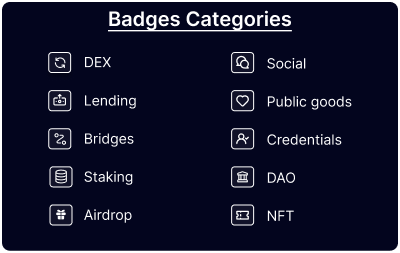 Badge Category: Describe the type of action/dapp related (e.g., DEX, Bridge). Adding these categories to the badge informations allow users to filter and explore badges easily in the explorer, but it also allows to develop different score for different communities (an NFT community could give more power/score to badges related to NFTs).
